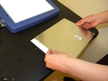 7. Take the paper off the adhesive and lay the chart upside down on a table. Line up the flashing shingle and place on top.